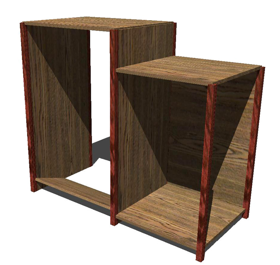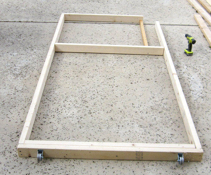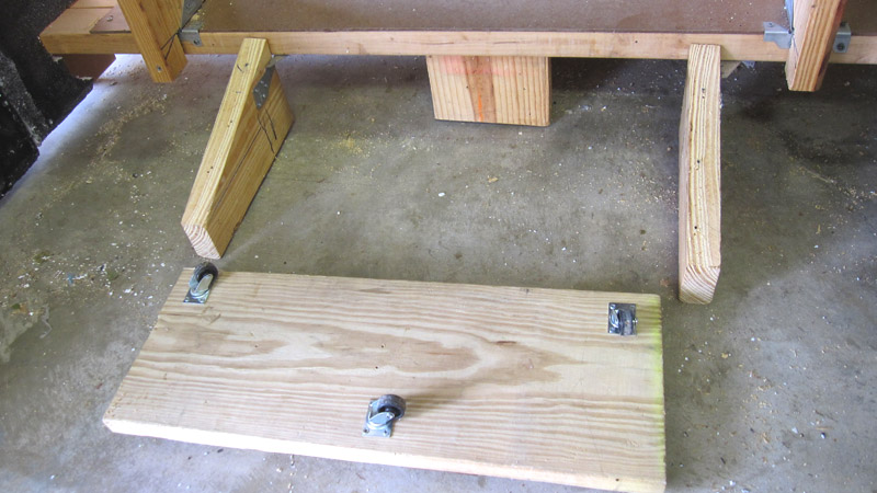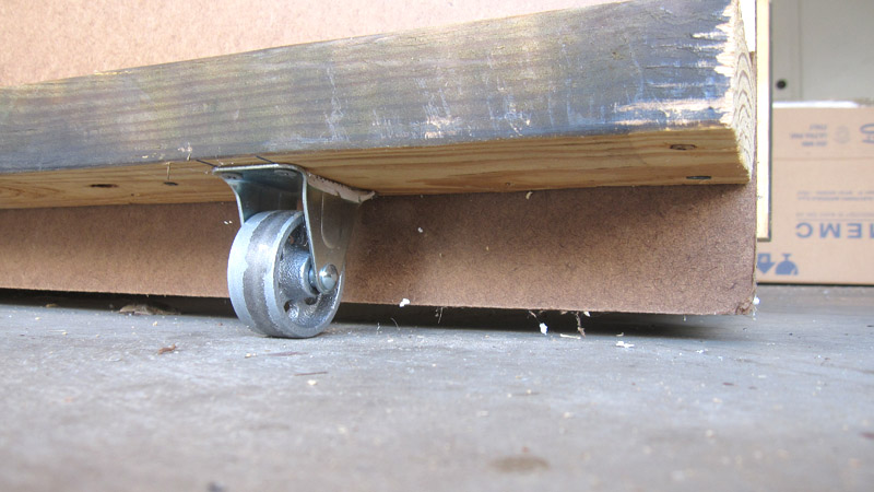 So, with the video the upper image makes a little more sence. I used fixed 2" metal castors to make the box roll and hid them behind the wood panels.