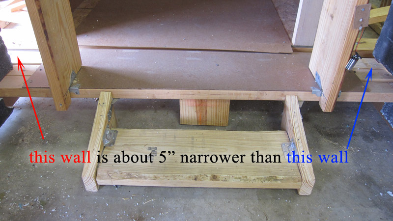 One other annoying issue is that the walls need to meet up to the elevator entrance, but cannot drag on the elevator doors. The inner door is not a problem because it is only 1/8" thick. The outer door, however, is 4" thick. Therefore, I had to make one wall 5" narrower than the other so that the wall didn't hit the outer door during the transition. I don't have a great picture of that but here is a picture that shows both walls (sort of).