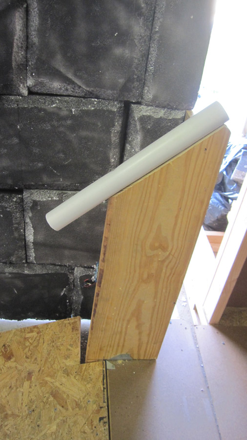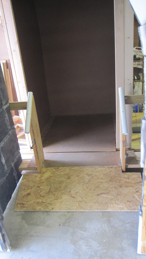 It was then just a matter of putting down some 1/2" plywood that almost toucched the floor but did not drag. The hand rails were made of wood and PVC pipe. I could have painted them but I did not bother.