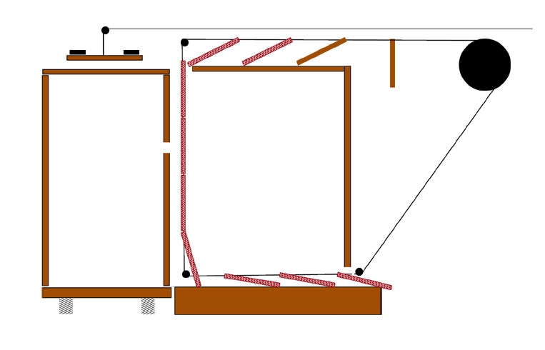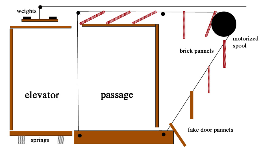 After I close the inner and outer set of doors, I will raise the front set of spools and run the panels up to the outer door. The first few panels are a duplicate of the outer door. I will then briefly turn out the lights in the elevator and open the outer door remotely by pulling on a rope. I then turn the lights back on and they will never realize that the outer door has been switched. I then (safely) drop the weights to make the elevator jolt and start the panels moving. as shown in the picture below.