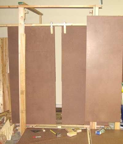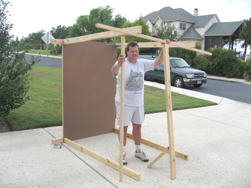 For the floor, I took two 6' two-by-fours and bored holes through the ends so that they would slide freely over the bolts in the base. I then cut 5 two-by fours to 5'5" and attached them to the 6' sections with brackets, spaced out one board per foot. This created a good support for the 4'x6' hardboard floor (you can get a thick 4'x8' hardboard panel from Home Depot for about $9. Get the thicker one so that the kids don't put a foot through it - they will jump up and down once they sense that they are on springs. Actually, I am going to used two boards just in case. After attaching the hard board panel, I attached 6' two-by-fours to each corner with screws and brackets. I have always done my haunted houses completely on my own. This time, a actually needed help, so I recruited my friend John to hold a few things for me. Thanks John!