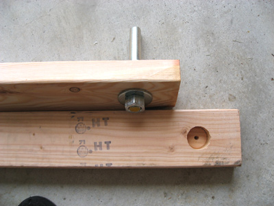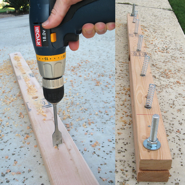 For the base, I stared by boring a bunch of holes into two 6' 2-by-fours using my hand drill and a "Speed Bore" bit I bought from Home Depot. I also bought a 2' section of 1/4" threaded bolt and (sigh) cut it into four 6" sections with a hacksaw. The lady at Home Depot assured me that it was soft steal and would cut easily. Actually, it wasn't that bad. I drilled seven holes in all evenly spaced. The five center holes a bored 3/4" deep and the holes at the end I drilled all the way through. The the five center holes I put compression springs (rated 25 lbs, Home Depot again) and put the bolts through the end holes. I attached it to another two-by-four with a couple of screws but bored a hole large enough to fit the hex nut so that the boards would lie flush.