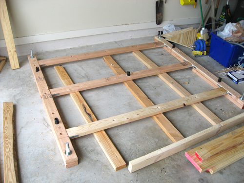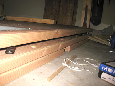 When I tested the springs, I found that they were way too soft (I planned on using 25 of them). Well, a co-worker had some old valve springs from his Chevy so he gave me some. These are really stiff so I just needed five of them. You can get valve springs from an auto shop or maybe you can go to a garage and get some old ones for free. Anyway, the valve springs are the black cylinders in the picture. I used a bore bit to sink them 1/4" into the wood then made my 4'X6' frame (actually, it's a 6'x6' square but the actual floor will be 4'x6').