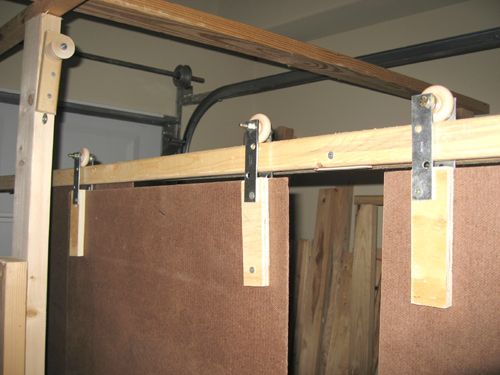 I wanted the doors up open from the center like most elevators. This haunted garage will use a total of five rolling doors and I was frustrated to find that rolling wheels at Home Depot were relatively expensive. Then I found, quite by accident, a big score at Hobby Lobby. They sold a whole bag of wooden wheels for less than $4. Perfect! So I made the doors from the same hardboard I made the elevator floor out of (but used the thinner panel for better weight and cost) and used some 4" brackets to attach the wooden wheels. Two wheels per door worked fine. I used several washers to keep the wheels centered on the track, which is just a 1"x1/2" board. I found that suspending the doors from the top was much better than putting the wheels on the bottom of the doors.
