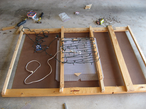 For the roof, I used some more hardboard and got a couple of plastic frosted light panels from Home Depot. I used one 75 watt white light bulb (which I put on a plug-in manual dimmer I found) and also strung up some red Christmas lights above it. The white and red lights I could operate independently so that the elevator is brightly lit when they walk in, but the light soon flickers and goes out leaving them in darkness for a few seconds and then the red "emergency lighting" goes on casting everything in an erie red light. Lighting is everything in a haunted house and this simple effect is really unnerving.