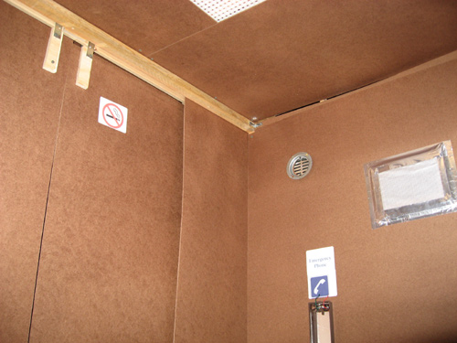 OK, it's pretty hard to get a good picture of the inside of the elevator but I think you can see the important stuff from this angle. You can see the closed doors on the left, part of the light panel at the top, and to the right you see the speaker, ripped-out emergency phone (just a box with a few wires hanging out) and the frosted window in which light bands moved across to give a lame visual of motion (this being my biggest dissappointment. If I only had one more day to work on the brick panels...) I won't bother with the details on making the light bands. Basically, they were battery-operated mini fluorescent lights attached to a slow-spinning wheele.