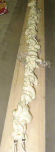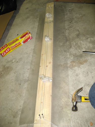 I laid down a large piece of wax paper over a 6 foot long two-by-four then drove two nails into each side of the board. I spaced the nails less than a 1/2 inch apart. I then tied two pieces of string to the nails as shown and pulled them tight so that the strings were held up about an inch from the board (leave about 6 inches of extra string at one end). I wadded up two to three small balls of plastic wrap and placed them under the strings. These will act as joints so that the tentacles can bend.