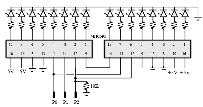 Now, the elevator I created needed more LEDs than a small controller could handle. So, I did two things. I went to the PROP-2 which has more outputs. I could have hooked things up exactly as I showed above with the 5-light example only using OUT0 thru OUT9. However, as is goes, PROP-2 uses a better processor which let me use a 74HC595 chip. Now things are getting a bit more complicated (though still relatively easy) but a pair of 74HC595 chips can let you control up to 16 LEDs independently using only three pins. If you don't want to do a bunch of soldering, just ignore this step. However, this is what I did as a total novice. Buy two 74HC595 chips (Jameco.com for about $0.50 each) and make yourself the following circuit board: