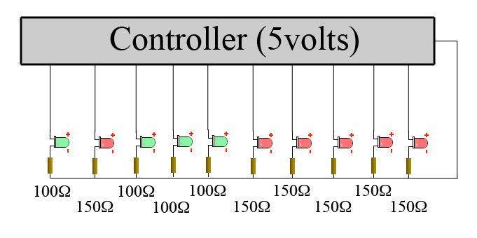 Each LED has a resistor attached to the negative lead (the shorter one) and the type of resistor depends on the color of the LED. The green ones get a 100 ohm resistor (1/4 or 1/2 watt is fine) and the red ones get a 150 ohm resistor. All of the negative leads and connected together and attached to the controller's ground. The positive leads connect to the controller in a way I will describe later. Soldering is as easy as it gets here. Just twist the wires together and put a glob of solder on.