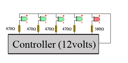 You should notice that in this simpler case, I flipped things on you and the LEDs share the positive lead and are controlled individually by the negative leads. The negative leads still have their resistors attached in between the controller and the LED but, since the voltage is greater the resistor values upped to 470 and 560 ohms. OK, just in case you don't follow, here is a schematic for the simpler version: