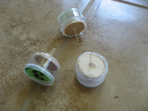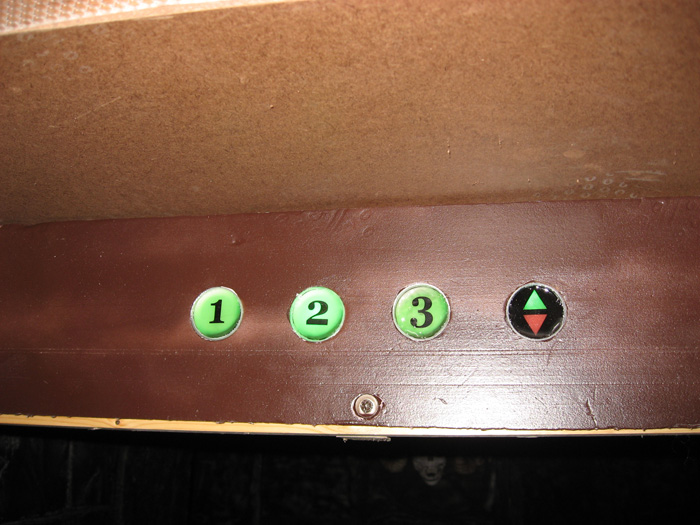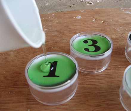 First thing I needed was to make the visible lights. I found some cylindrical plastic boxes (1.5" in diameter) at a craft store indended to store beads. I made a 1, 2 and 3 on a green background (using Photoshop), cut them out and glued them to the back of the boxes. I then poared some clear arylic over the numbers to make them look like glass. I had a 1.5" bore so I could easily cut some circles out of some 1/4" plywood and put a green LED at the center. Hot glue the plywood at the top of the box and I've got floor lights.