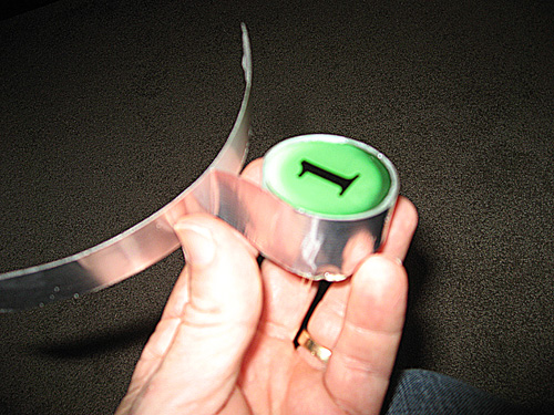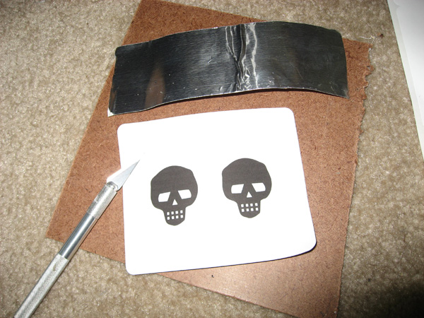 My next buttons are invisible at first, but show up as red skulls when lit. I made a skull stencil from some clip art and printed it on a lable. I then attached the stencil to some foil tape. Useing the stencil as a guild, I used a razor blade to cut out the skull.