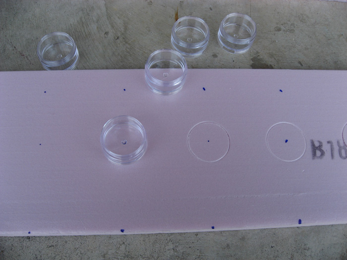 So, now I need the light board. I used a single piece of 3/4" foam board which I would eventually paint to look like wood. I marked 4 evenly-spaced dots in the center of the board and used the pill boxes to mark a circle. Carfully cut out the circle with my 1.5" bore and, as the pill boxes were just larger in diameter than 1.5", I could just push them through for a snug fit.