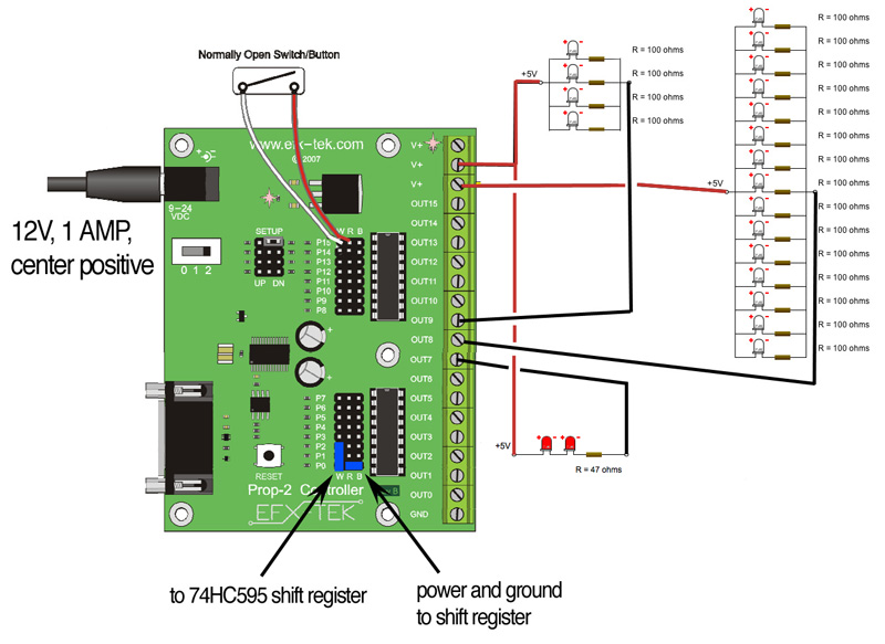 So, let's simplify things a bit and rather than controlling 10 lights, say you only want five. That is perfectly reasonable for a Halloween elevator. You can use either the Prop-1 or the Prop-2 and hook it up like so:
