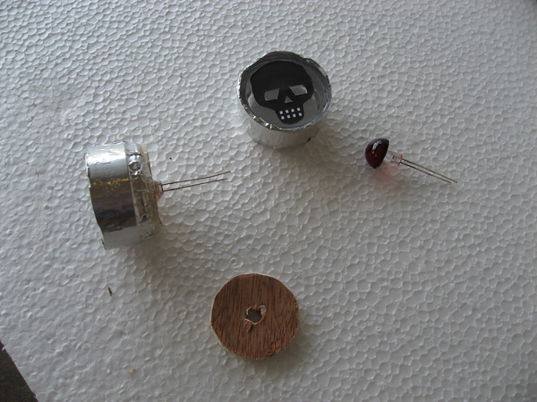 I then attached the skull tape to the front of the pill box, wrapped it in foil tape and put a ultra-bright LED in the back. Yes, I made a red acrylic lens for the LED but I don't think you need that. A small drop of hot glue on the tip of the LED should act good enough as a diffuser. I made five of these.