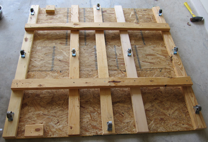 I bought another set of 2” castors for the 5’ x 5’ platform. These where the type that did not swivel. I attached them to the underside of the (braced) platform.