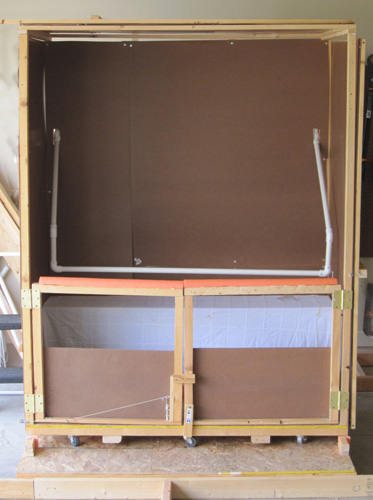 This page is under construction.....Now that we have a base, it is time to make the walls. The walls were 6' tall and every wall ended up with some movable element. The three walls and ceiling were made of hardboard from Home Depot. I started by making a frame with 2 by 2s and moved forward from there. I used heavy braces to attach the frame to the platform.
