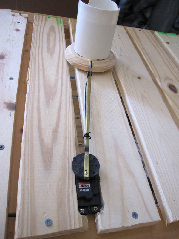 The candle on top of the box is connected to a quarter-scale servo (Hitec 805BB, a relatively strong servo). This would be visible if the kids walked up close, but since they are sitting several feet back, they can not really see the servo. I put teflon skids on the bottom of the candle platform to let it slide easier. The candle itself is really just a cut piece of PVC pipe with some candle wax on it and a yellow LED hooked up to a flicker circuit.