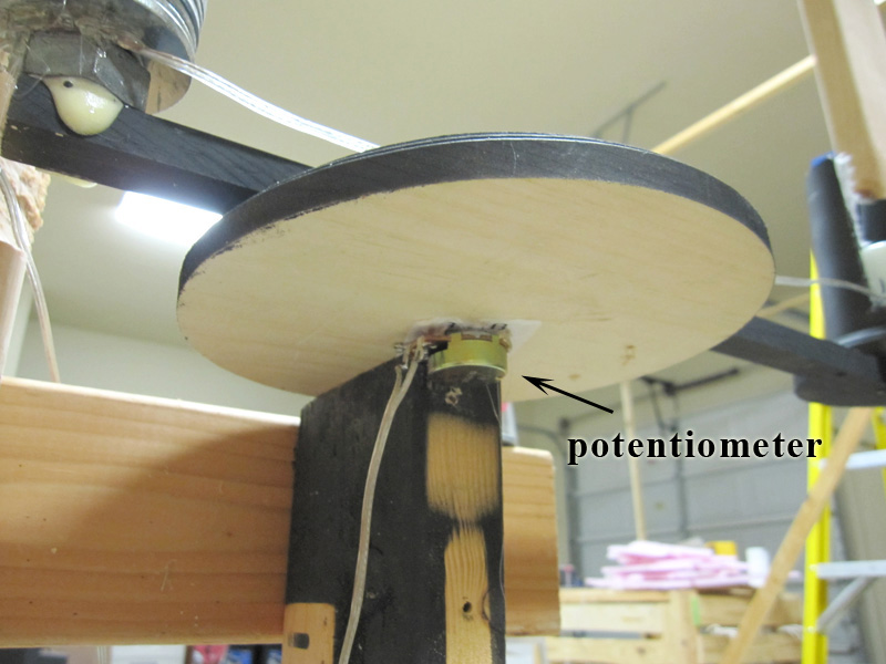 The shaft holding the black candle is attached to a 100K ohm potentiometer. The candle can rotate around the shaft of that potentiometer, essentially working as a giant dial. The big washers on the back of the arm is a counterbalance and you can see two wood screws on the circular plate. Those screws restrict the rotation of the system so that you can control the start and finish positions on the potentiometer. That wire you see running to the black candle powers an LED. This is the second LED hooked up to the flicker circuit. You will notice that the back of the candle is open. That way the flicker light hits the ghost, but you cannot see the actual LED reflected in the shim. I should have used a few LEDs here instead of just one because the flicker off the ghost was barely noticeable.