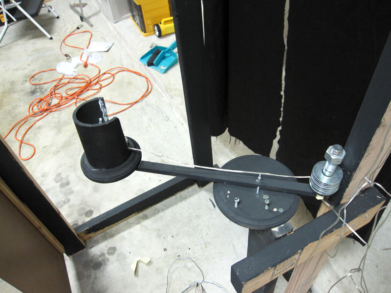 Below is a shot of the "ghost control" area. It doesn't look like much but it is precisely placed in the garage to be equal distant from the shrink film shim as the box. Those front panels are the same height and wide as the front of the box and that black candle is the same height from thru floor as the candle on the box. You can see three things in this shot.The first are the black curtains in the back. This hides the ghost actor until he is ready to make his sudden appearance by brushing the curtains aside. The second thing are the two smaller panels are on hinges and has a contact switch between them. Again, those panels correspond to the front of the box in the ghost viewing room and are the same height as the box. They hide the lower half of the ghost when he is "behind the box". When the ghost is ready to walk through the box, the actor kicks open the panels one at a time, giving the illusion that the ghost's legs are passing through the front of the box and appearing. The makeshift contact switch between the two panels will also break contact when this happens and will signal the servo connected to the chain to kick. Thus, as the ghost walks through the front of the box, not only does its legs appear but the chain moves as if he kicked it. Again, the chain effect got ditched at the last minute because my servo was too week for the effect. The last thing I want you to notice is that black candle floating in the center there. That corresponds to the candle on the box.