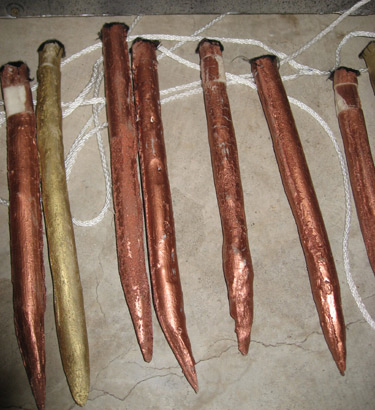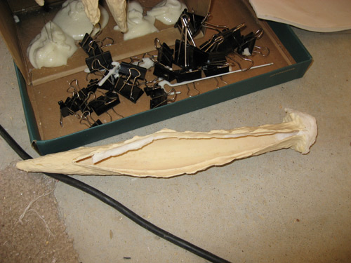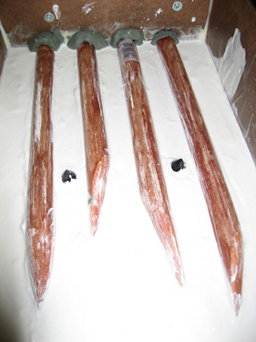 Believe it or not, this was the toughest part. I recently figured out how to make latex molds so I figured this would be easy. I carved four spikes from 1" wooden dowels and made a latex mold. I then got some 2-part 8lbs polyurethane flexible foam, mixed and poured. This approach worked fine when I was making skulls with ridged foam. The problem I discovered is that flexible foam is really hard to get out a a mold. It sticks more than the ridged foam and, since it flexes, there is nothing to push against. After ripping apart two of them, I just cut the others out, thus destroying the mold. I also found that this stuff is almost impossible to sand, so get the shape right or plan on using scissors.